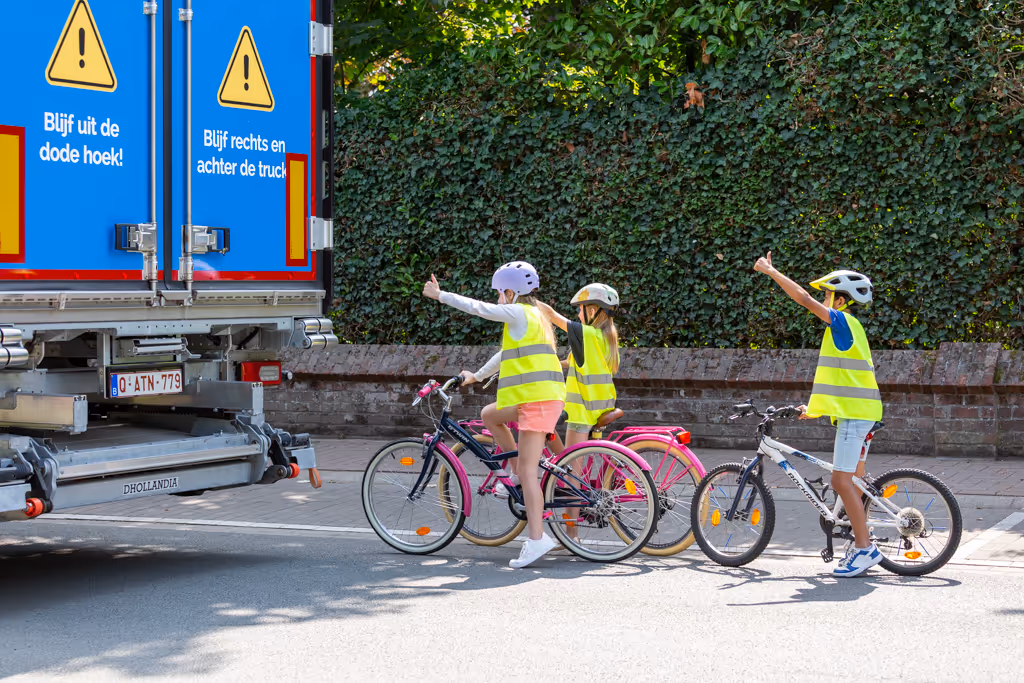 Al 25 jaar gaan we elk schooljaar langs bij leerlingen in het vierde, vijfde en zesde leerjaar. We geven hen eerst de theorie mee: wat kan een vrachtwagenchauffeur (niet) zien in de zones rondom het voertuig en wat zijn de vier vuistregels om uit de gevarenzones te blijven? Daarna leren ze de praktijk: door zich in en rond onze ‘Veilig op Weg’-vrachtwagen te begeven ontdekken ze zelf hoe ze veilig de baan op kunnen.